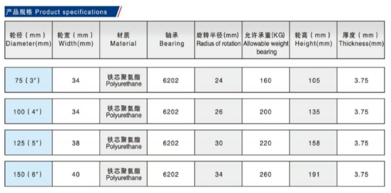 產(chǎn)品特點:固態(tài)焊接技術(shù),精密鑄鐵輪增強耐用性,聚氨脂粘接,嵌入滾珠軸承增強旋轉(zhuǎn)功能,雙層鋼球滑動,保證旋轉(zhuǎn)的靈活性。